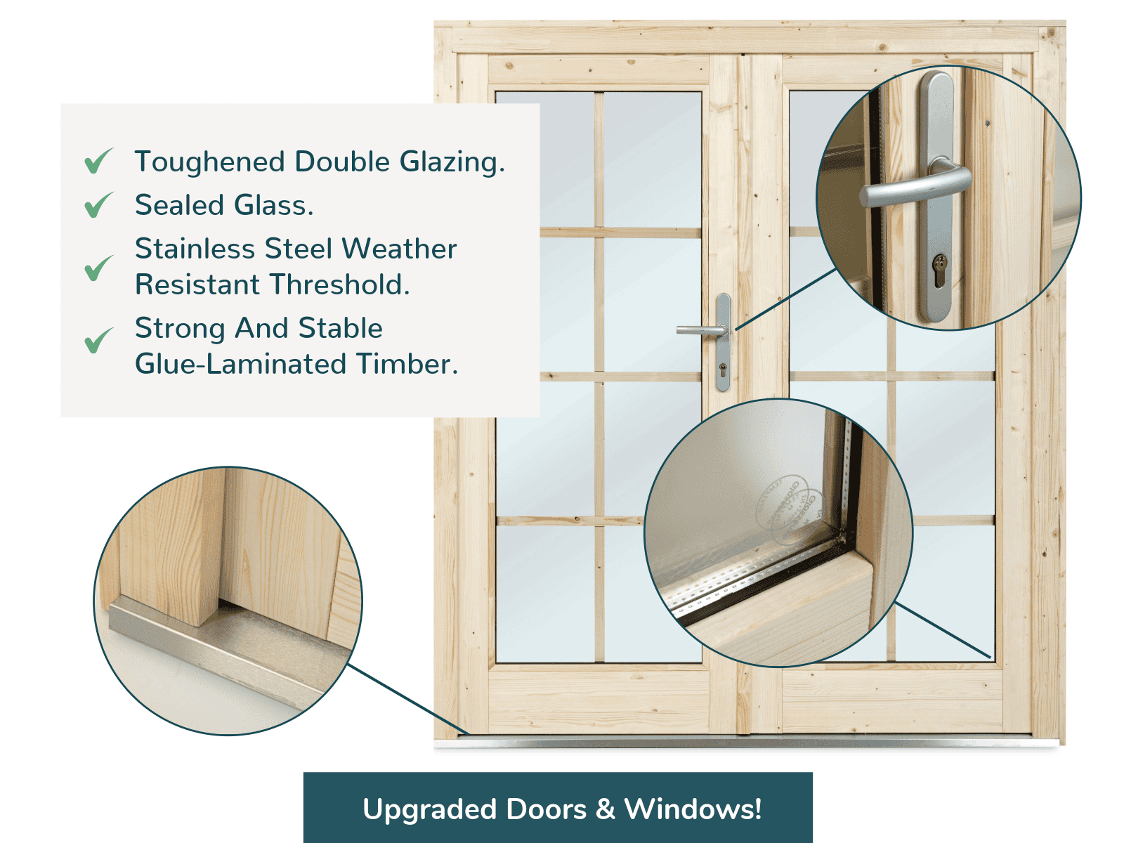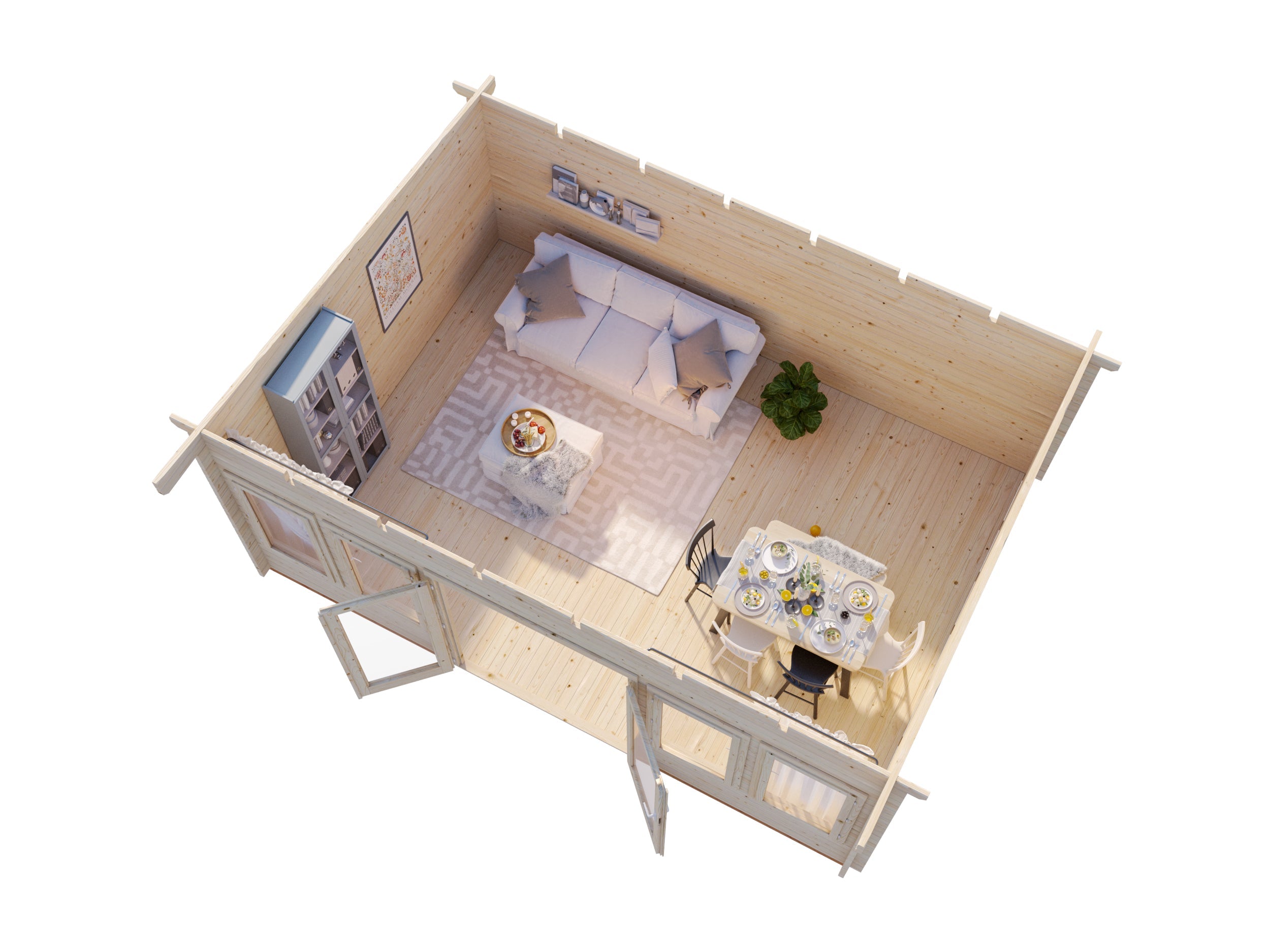 Lisa L (5,5x4m | 19,4m² | 44mm) Tilava pulpettikattoinen kesämökki kaksoisovilla (2024 päivitetty malli)