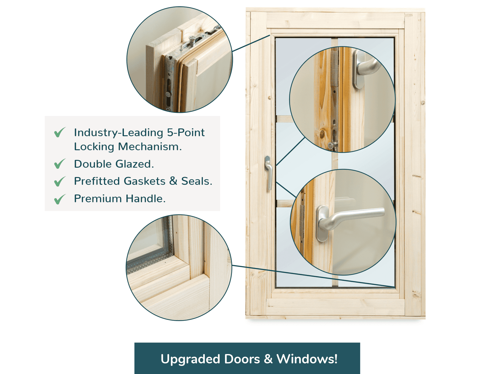 - Seinärakenne: 44 mm paksut hirret kaksoisuraliitoksilla, jotka parantavat eristystä ja kestävyyttä.