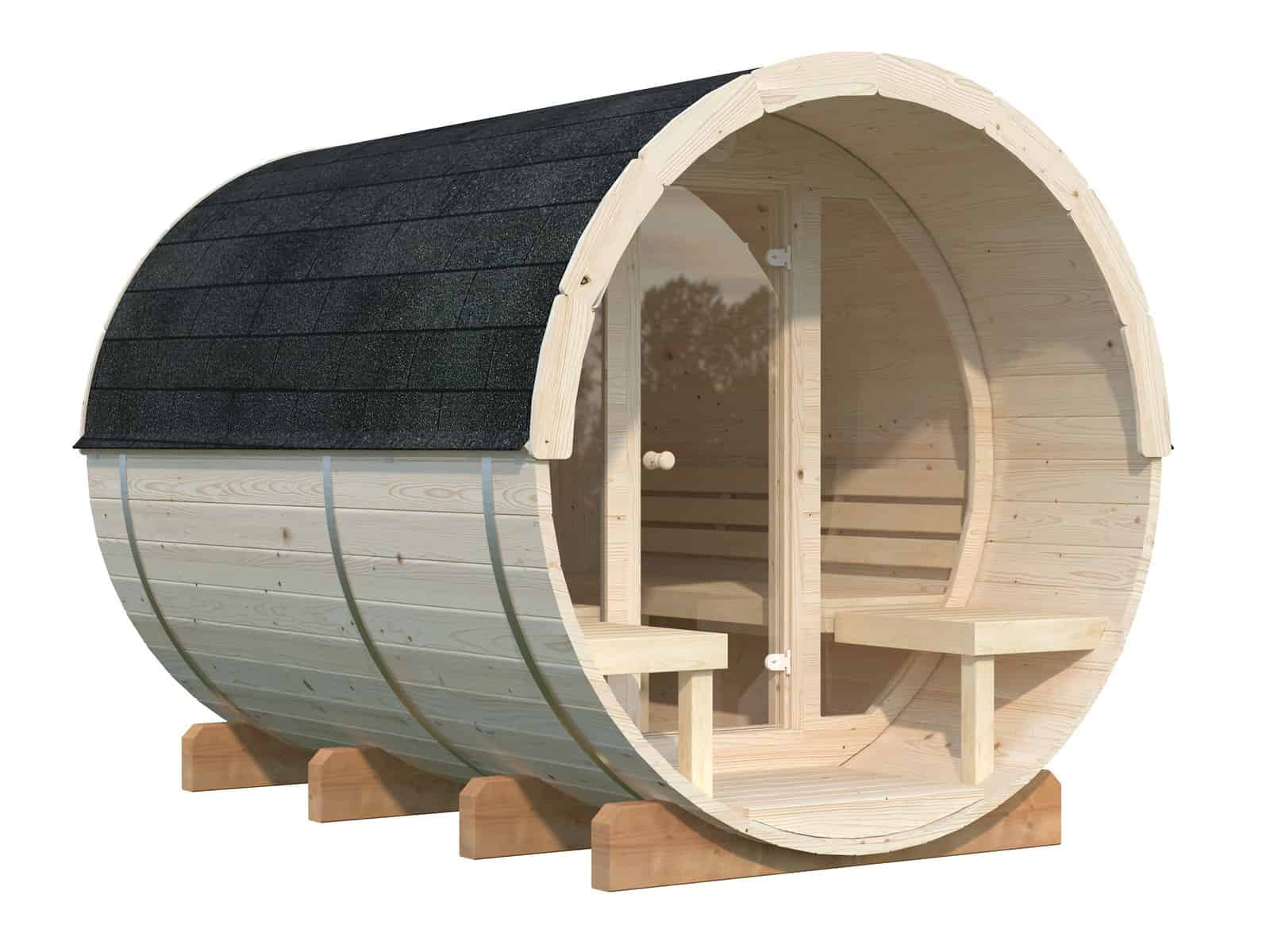 Anita L (2,2x2,9m | 1,6+0,7m² | 42mm) Puinen tynnyrisauna lasiseinällä