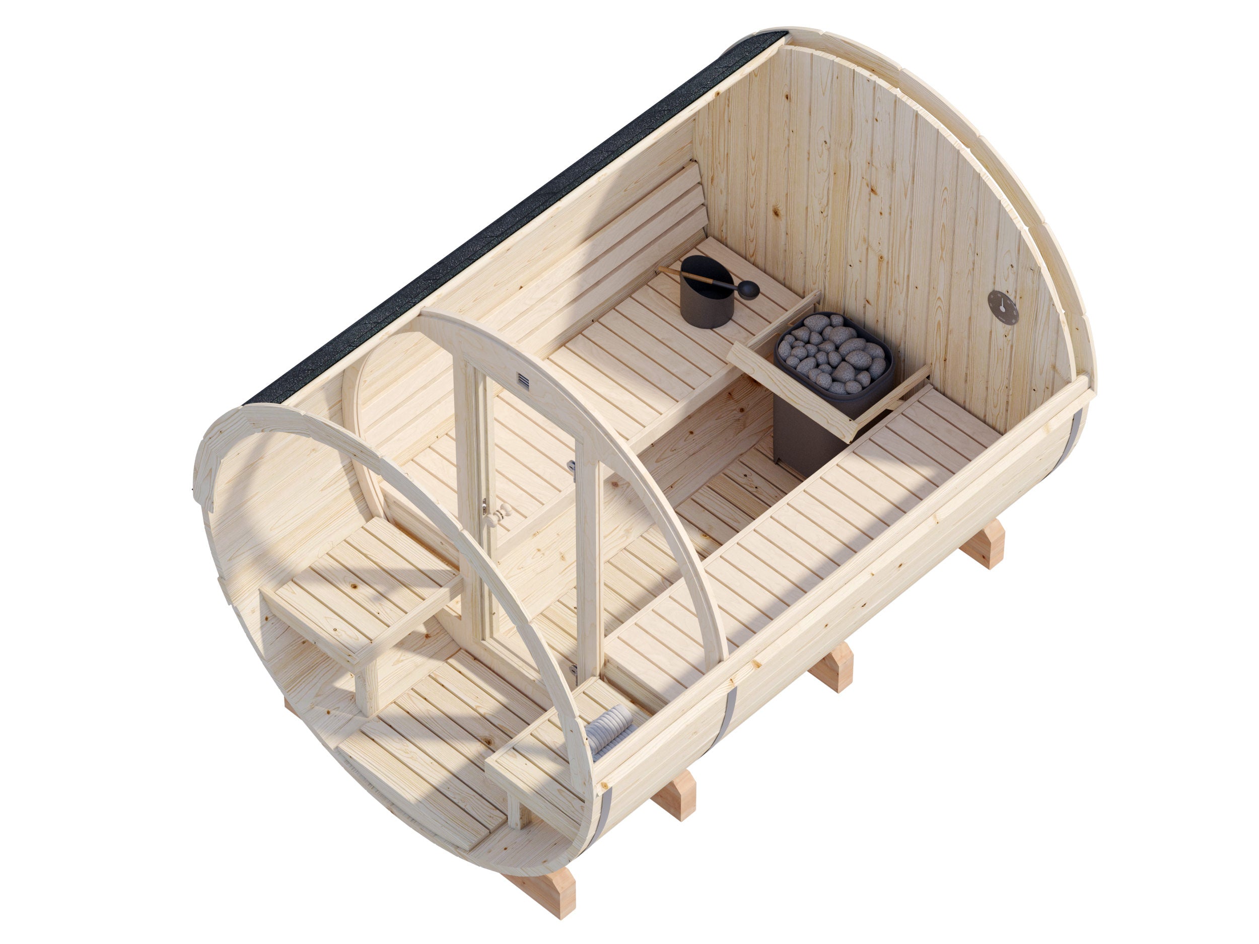 Tynnyrisaunan muoto edistää optimaalista ilmankiertoa, mikä takaa tasaisen ja tehokkaan lämmönjakautumisen. Kuuma ilma nousee luonnollisesti ylös ja kiertää saunassa, kun taas viileä ilma virtaa sisään alaosassa olevista tuuletusaukoista. Tämä rakenne varmistaa miellyttävän ja tasalaatuisen saunakokemuksen.