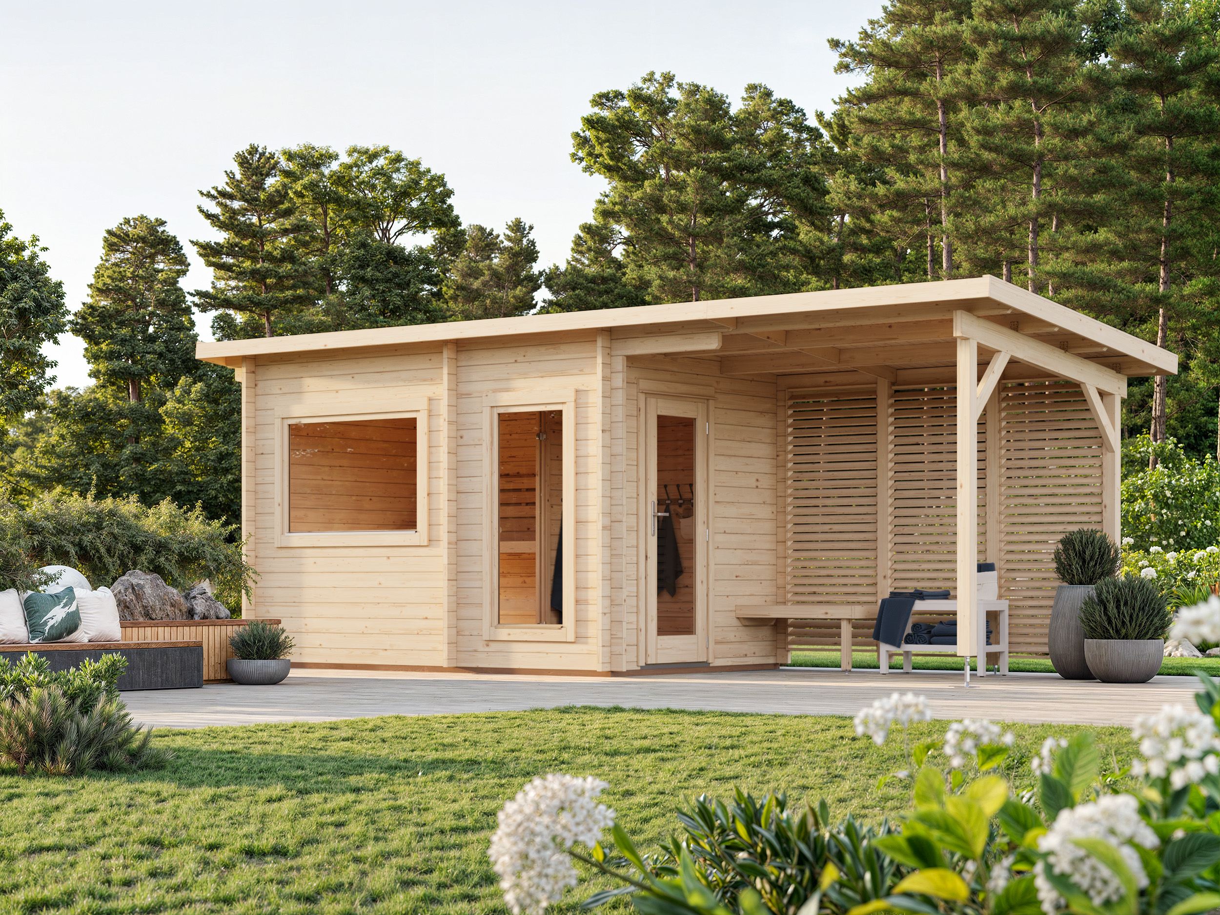 Sanna M+ (6,5x2,5m | 6,8+5,9m² | 44mm) Moderni pihasauna pukuhuoneella ja katoksella
