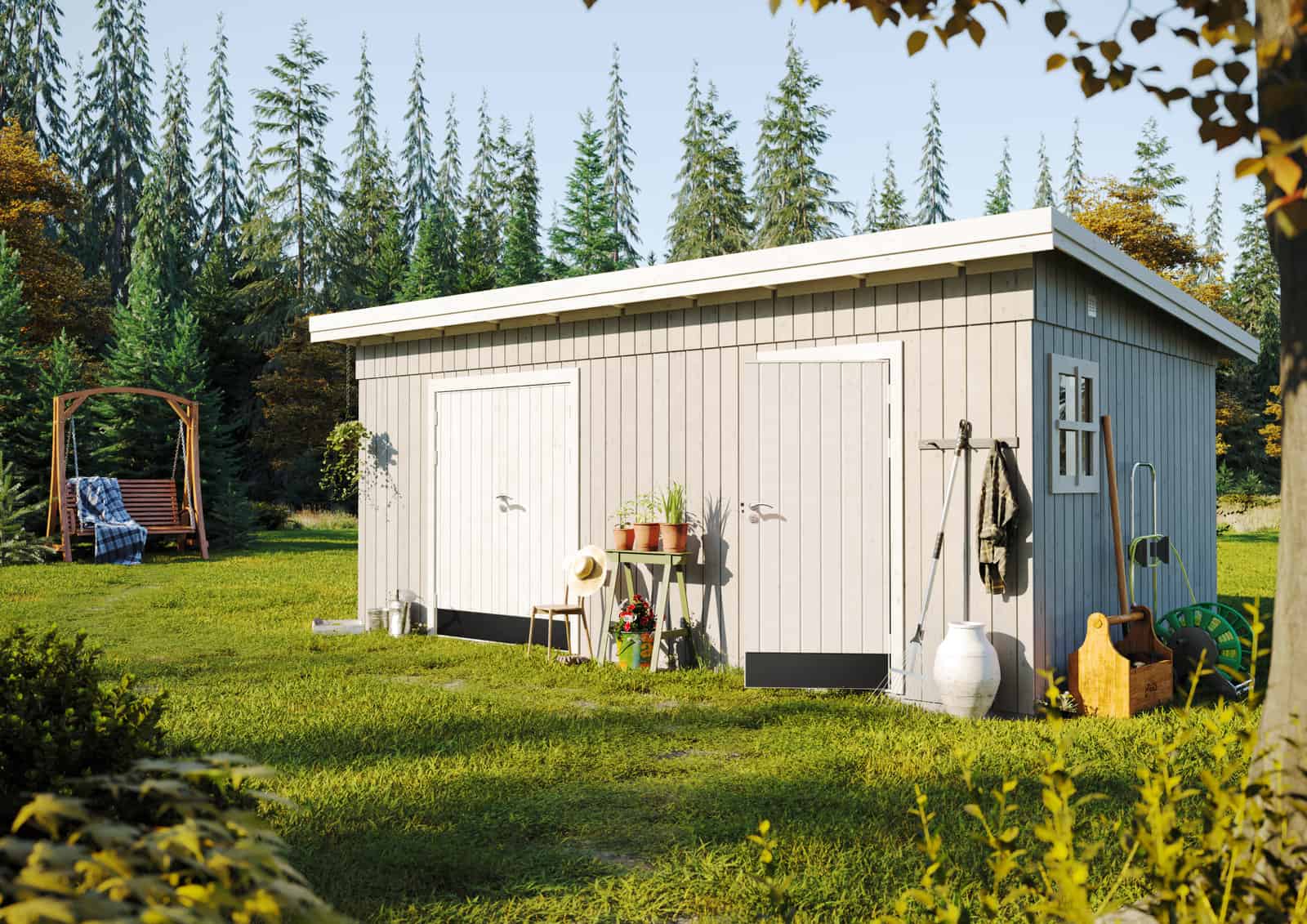 • Varastotila: Tilava säilytysratkaisu työkaluille, puutarhakoneille, polkupyörille tai harrastusvälineille.