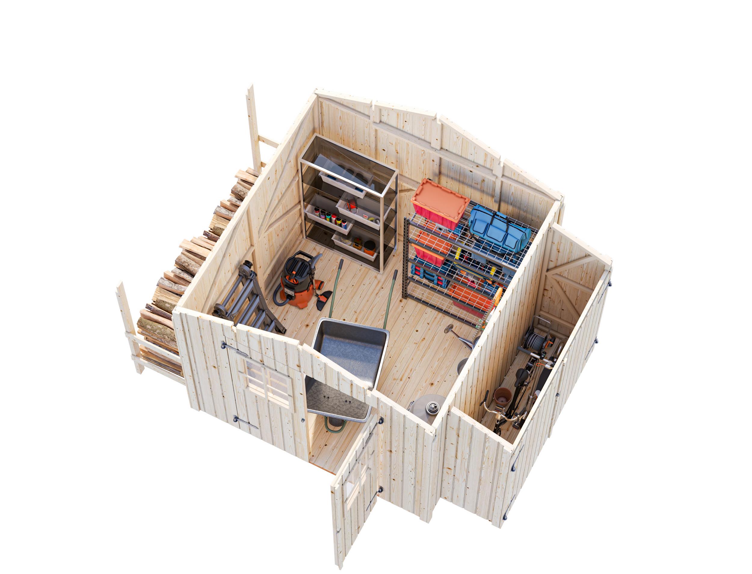 • Suurempi varastotila: Tarjoaa reilusti tilaa esimerkiksi polkupyörille, halkopinolle ja suuremmille puutarhatyökaluille.