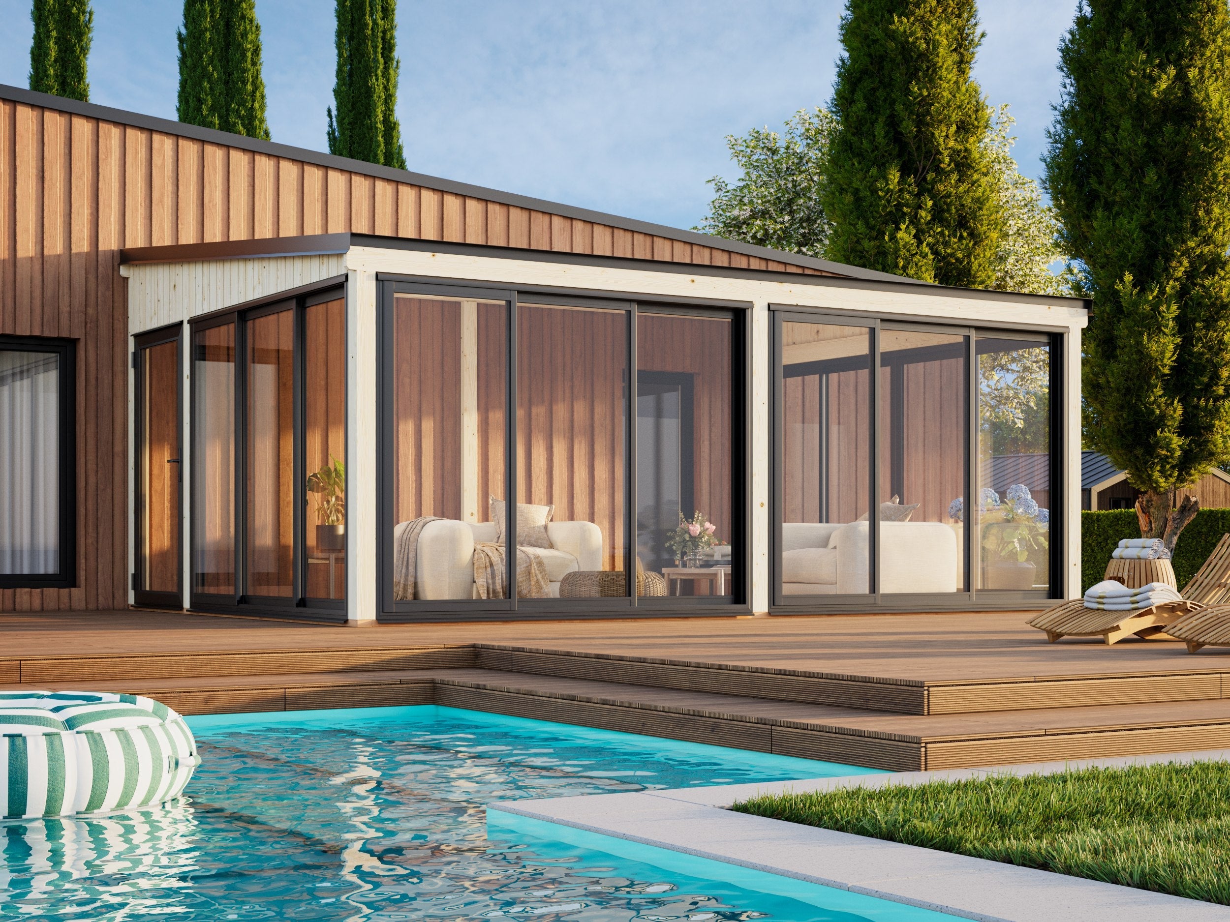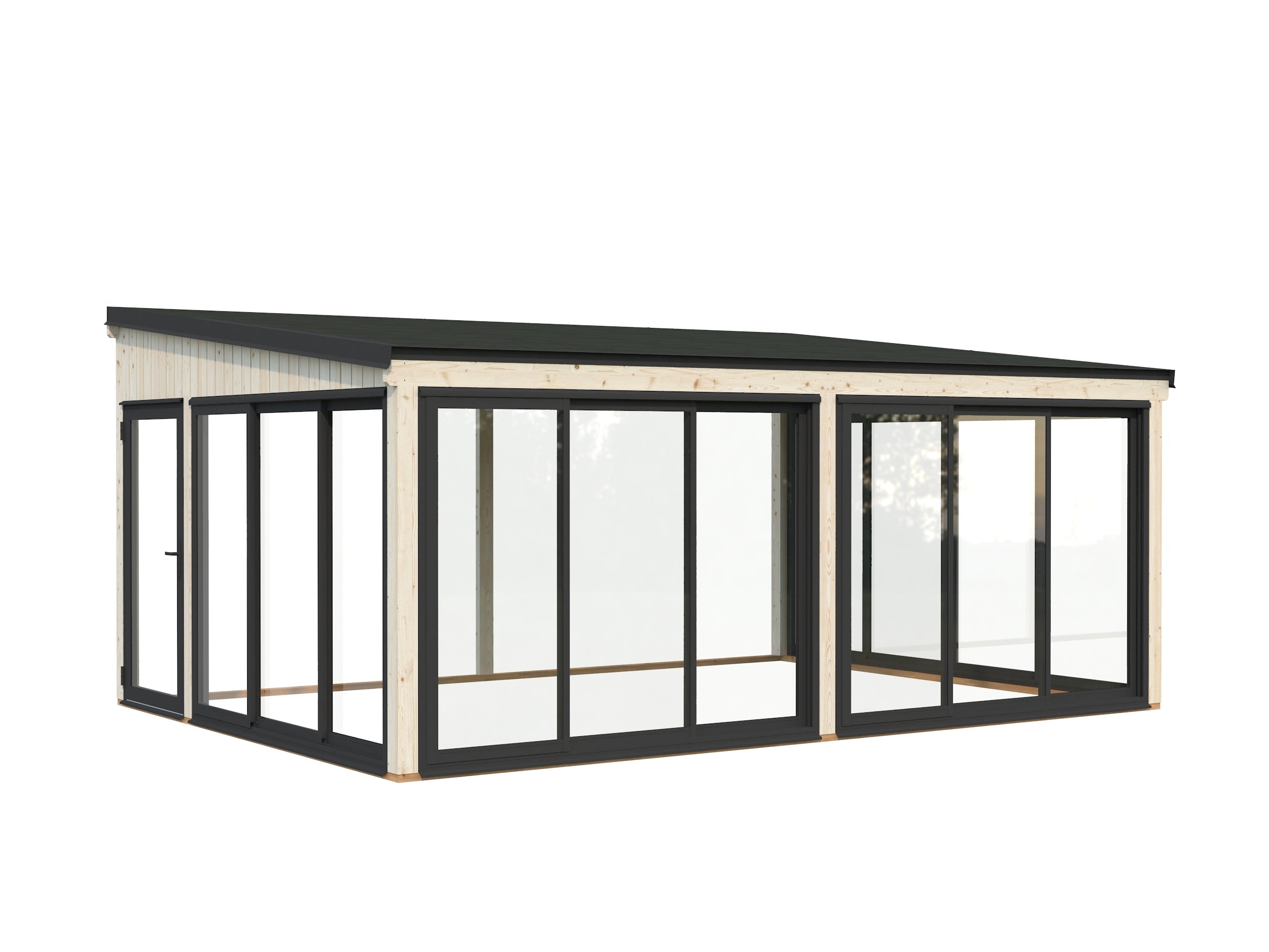 Lumi XL (5,8x4,2 m | 23,3 m² | 120x120 mm) Tilava kiinteä lasipaviljonki tai kesähuone pihaan