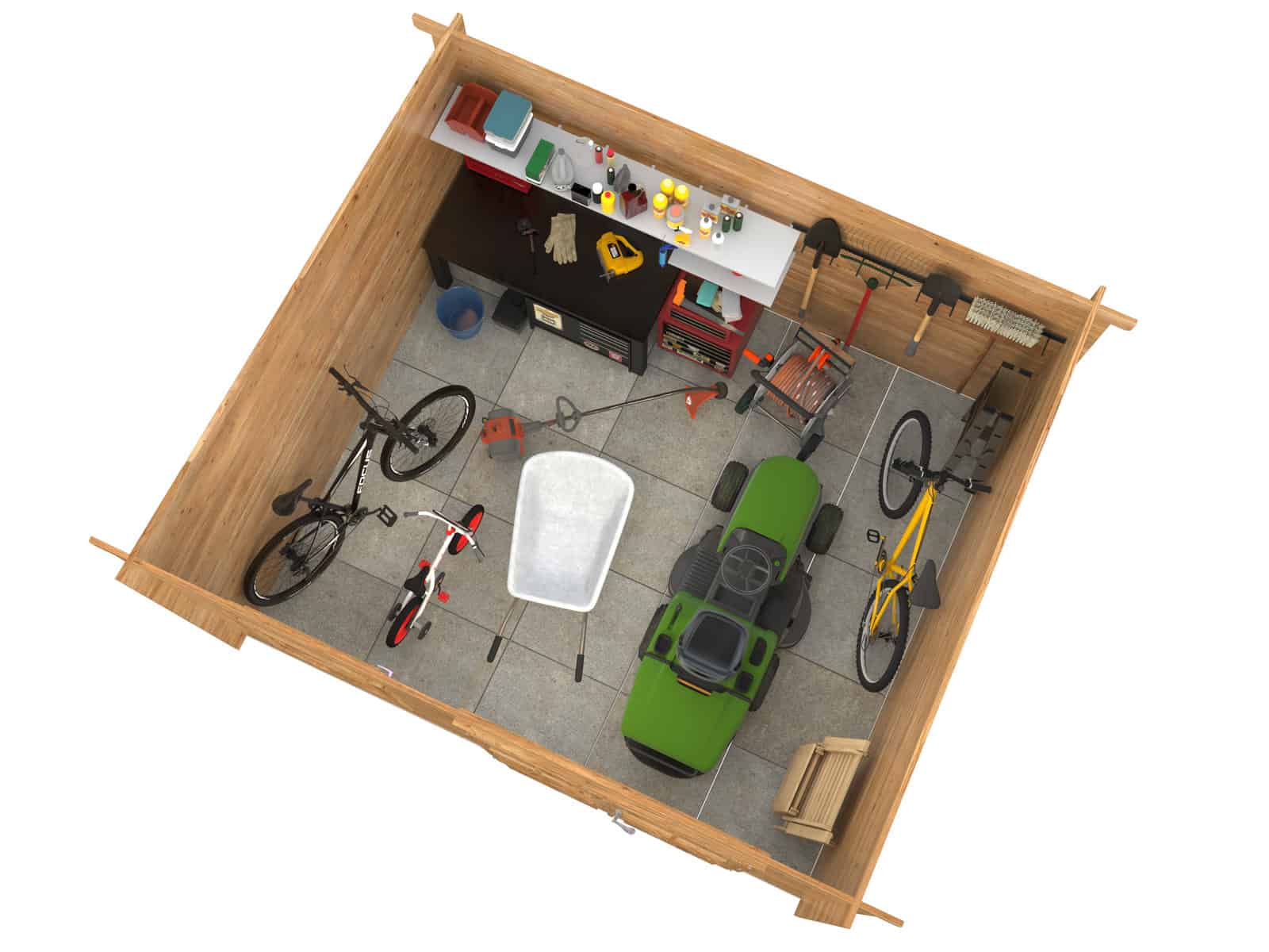 Alice-pihavaja (3.8x3.4m) tarjoaa vaikuttavan 11 m² lattiatilan, joka mahdollistaa puutarhakalusteiden, työkalujen ja muiden ulkotarvikkeiden säilyttämisen siististi ja helposti. Isot pariovet helpottavat tavaroiden järjestelyä ja mahdollistavat sujuvan kulkemisen vajan sisään ja ulos.