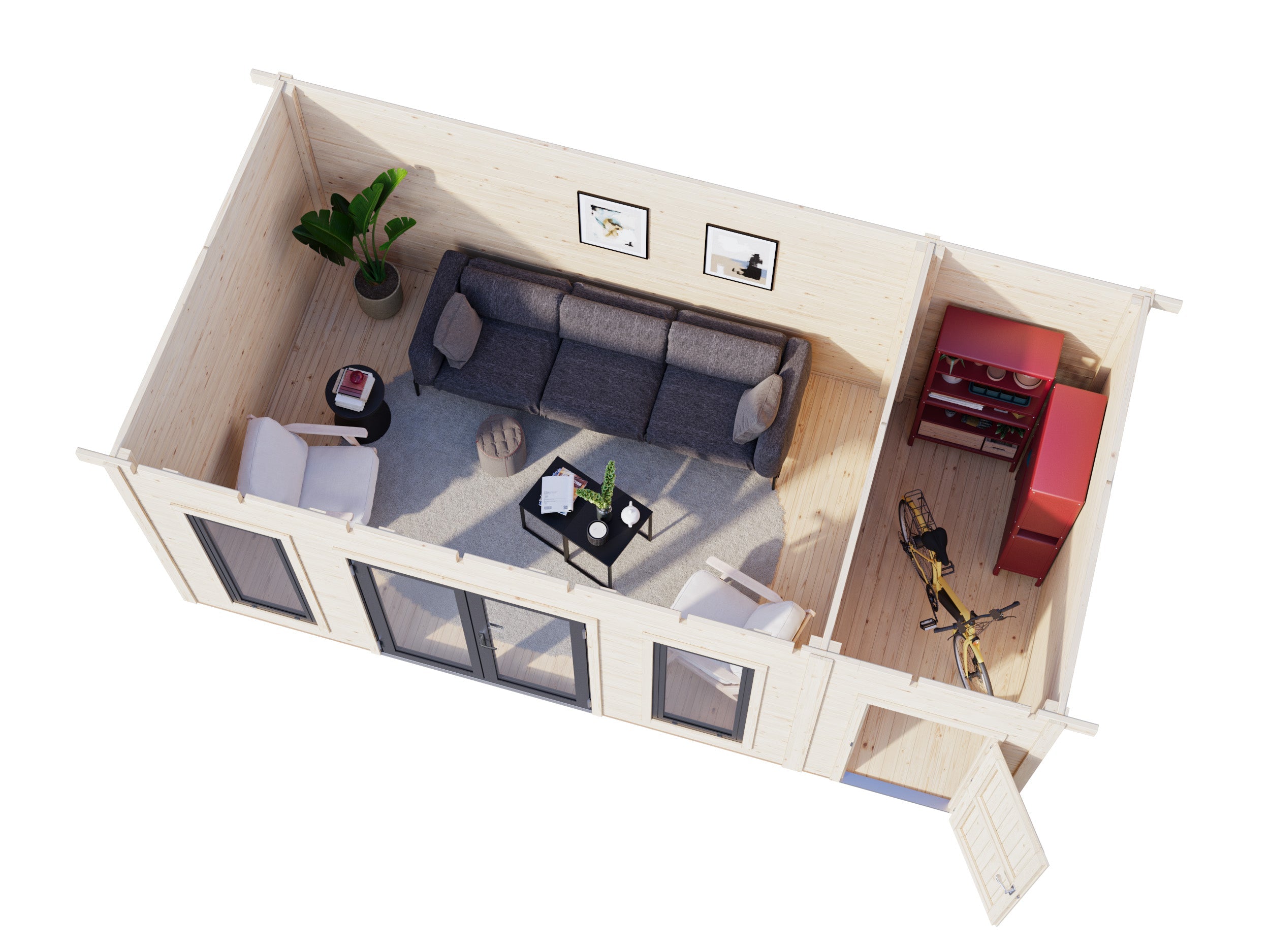 Rakennus on heti suojattu asennuksen jälkeen ja sen käyttöikä on pidempi kuin paikan päällä maalatuilla tuotteilla. Et tarvitse siveltimiä, pressuja tai tikkaita – eikä menetettyjä viikonloppuja tai sääriskejä. Uusi mökkisi on valmis: pura, kokoa ja nauti.