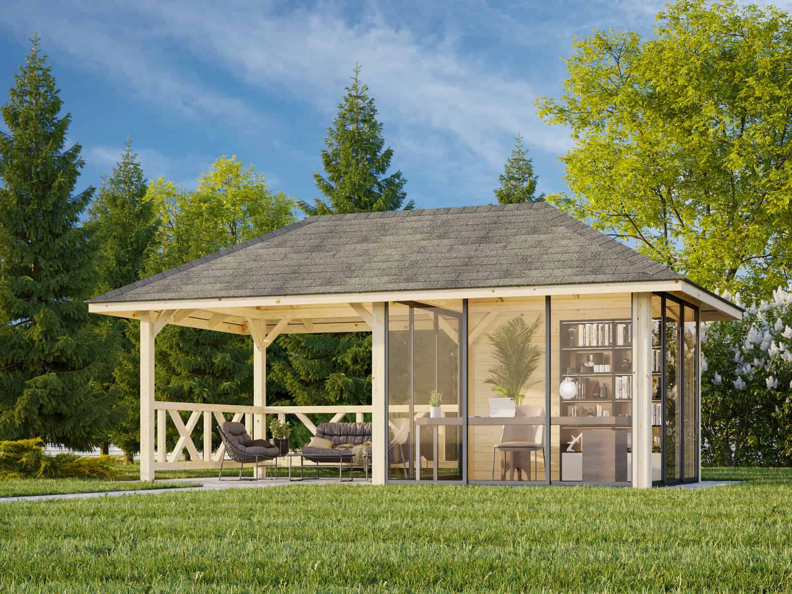 Bianca 204/504 (6x3m | 16,6m²) piharakennus kolmella lasiseinällä ja huvimajalla (saatavana tuplalasilla)