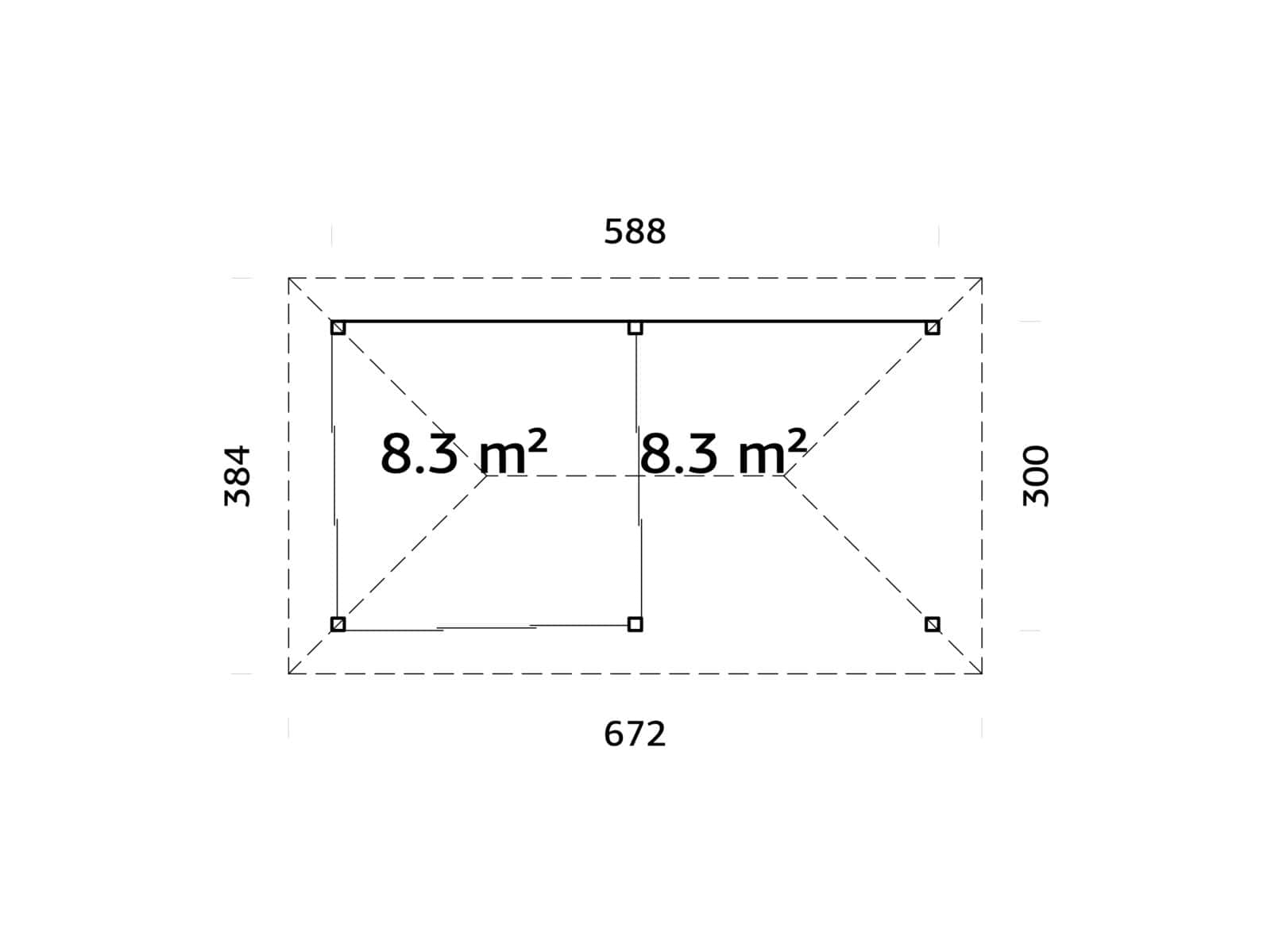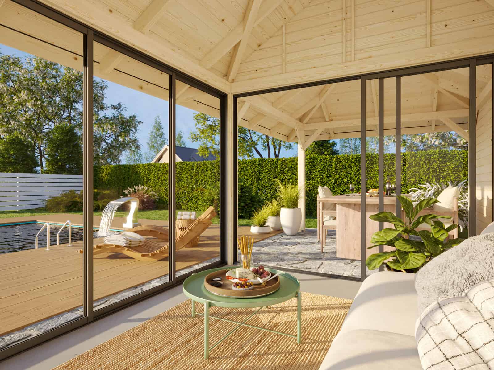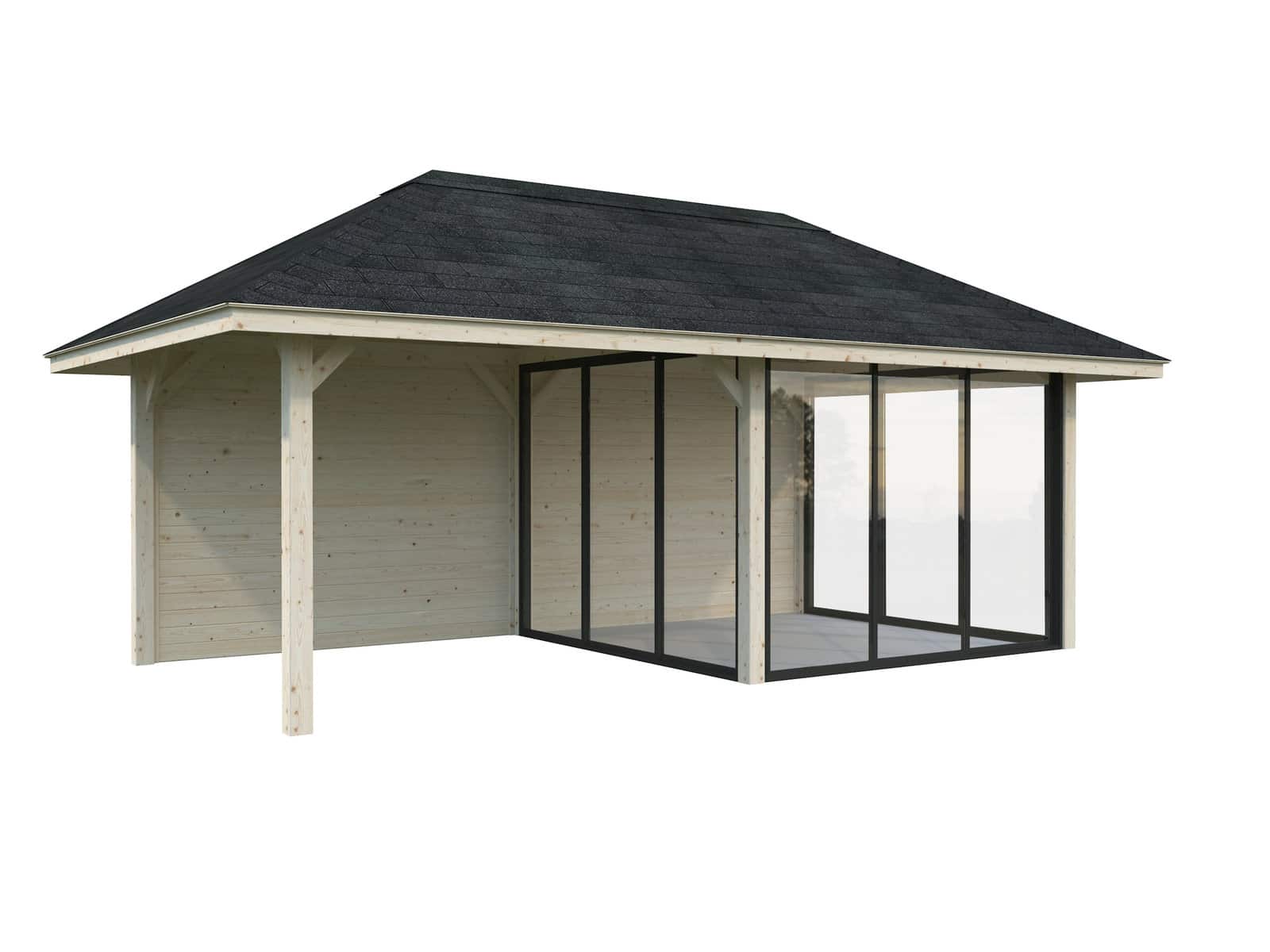 Bianca 206/506 (6x3m | 16,6m²) piharakennus kolmella liukulasiovella ja katoksella (saatavana tuplalasilla)