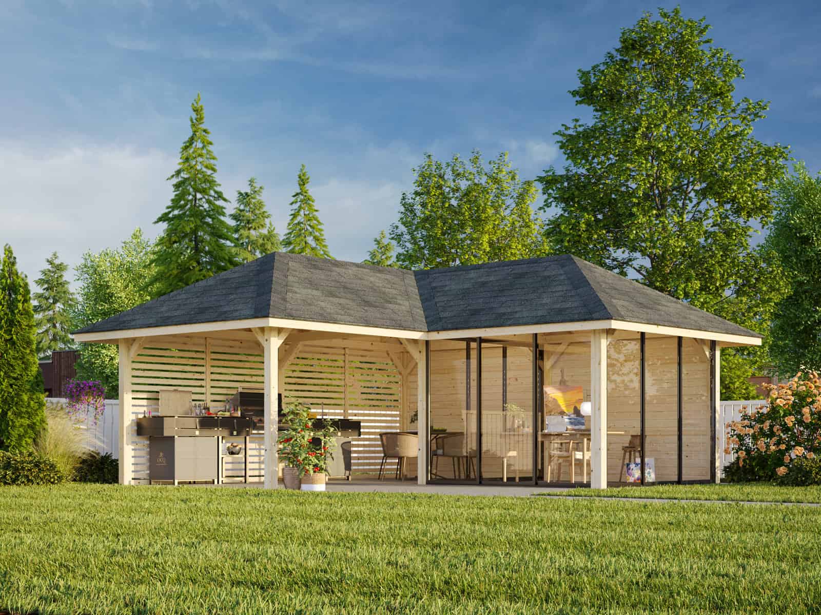 Bianca 211/511 (6x6m | 24,9m²) kulmakevytmökki liukuovilla ja sälekaihdinseinillä (saatavana tuplalasilla)
