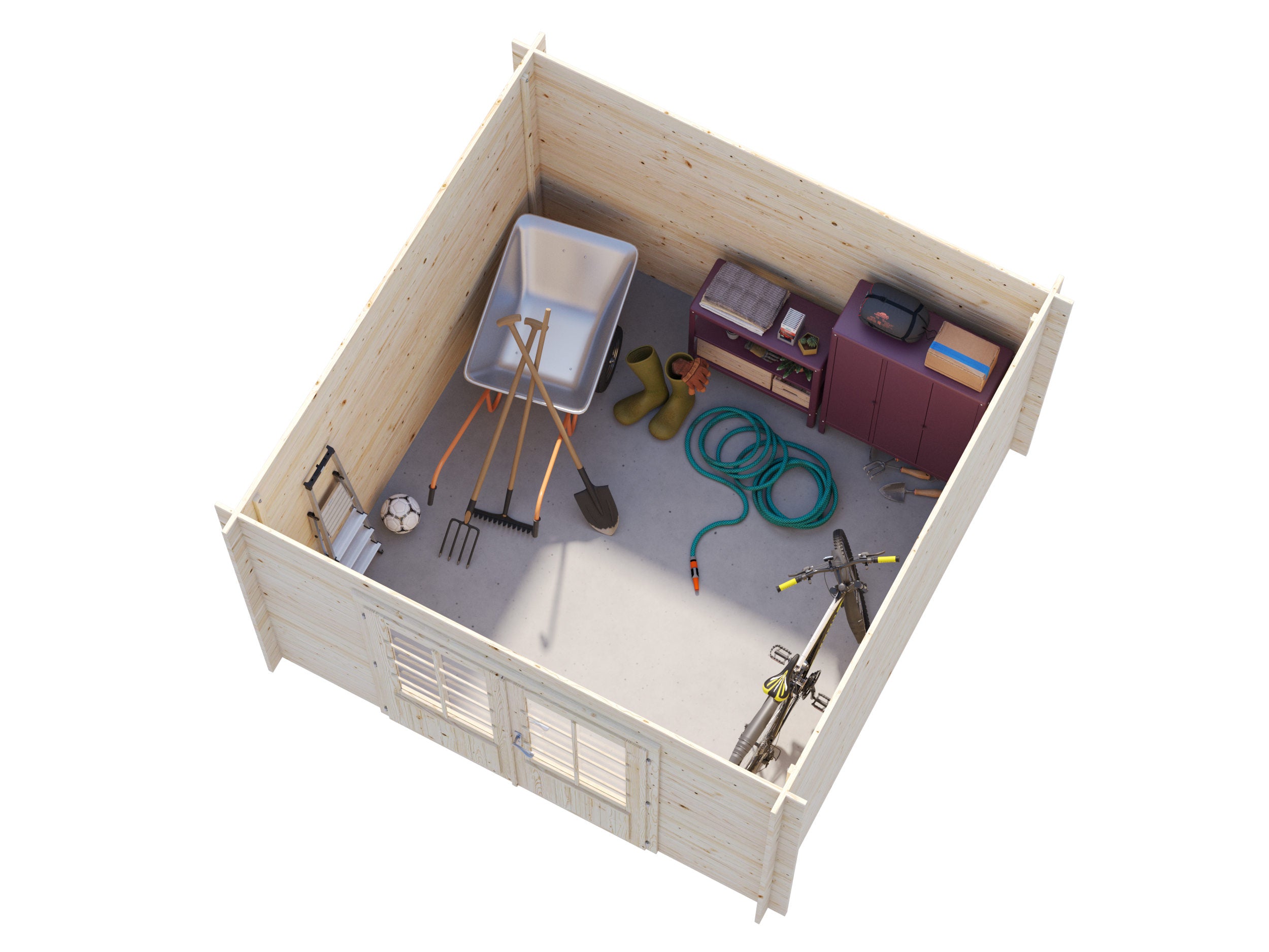 - Ulkomitat: 320x320 cm, kompakti mutta tilava pihamökki, joka sopii useimpiin pihoihin.