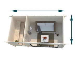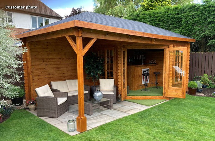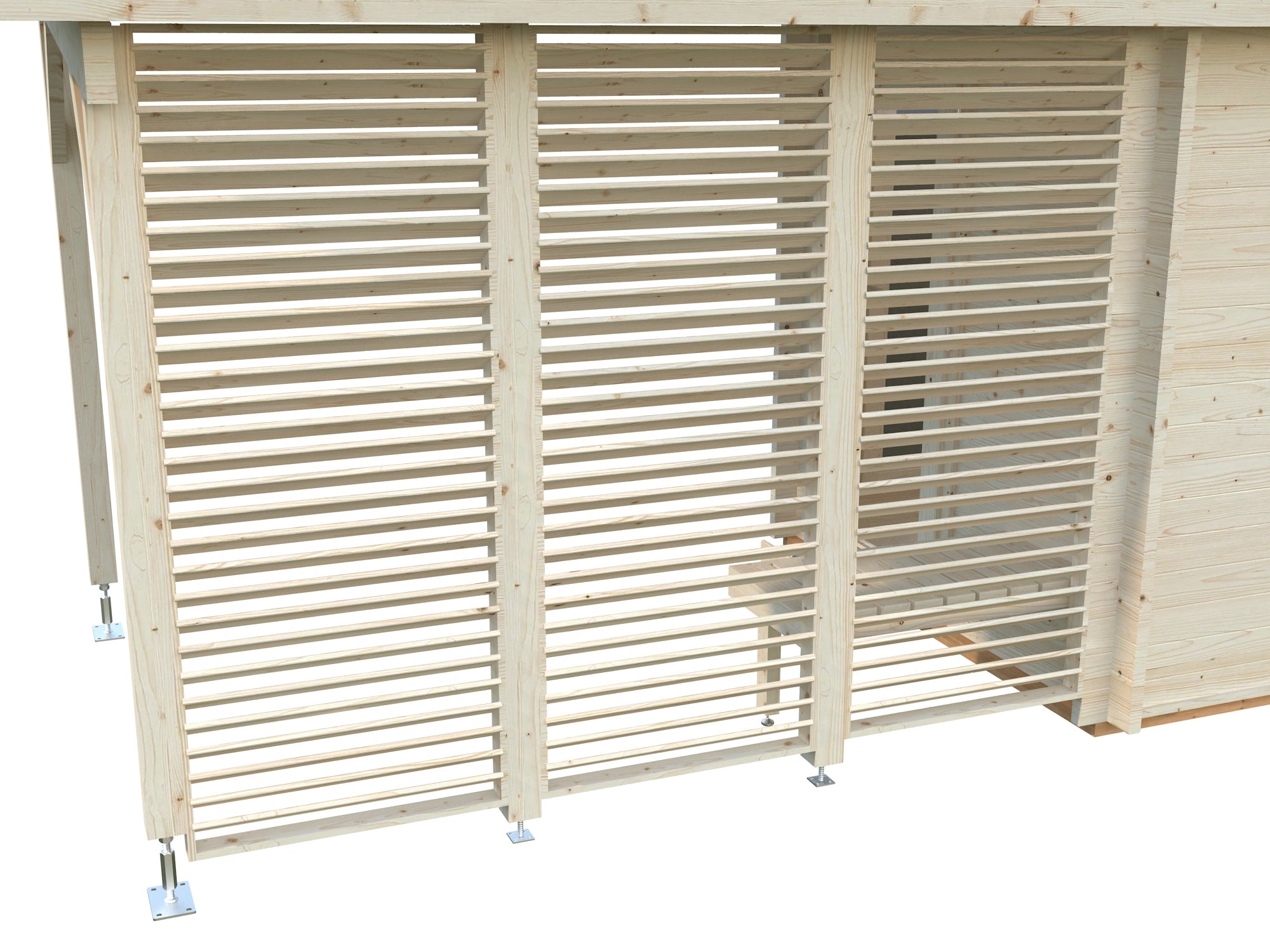 Sanna M+ (6,5x2,5m | 6,8+5,9m² | 44mm) Moderni pihasauna pukuhuoneella ja katoksella